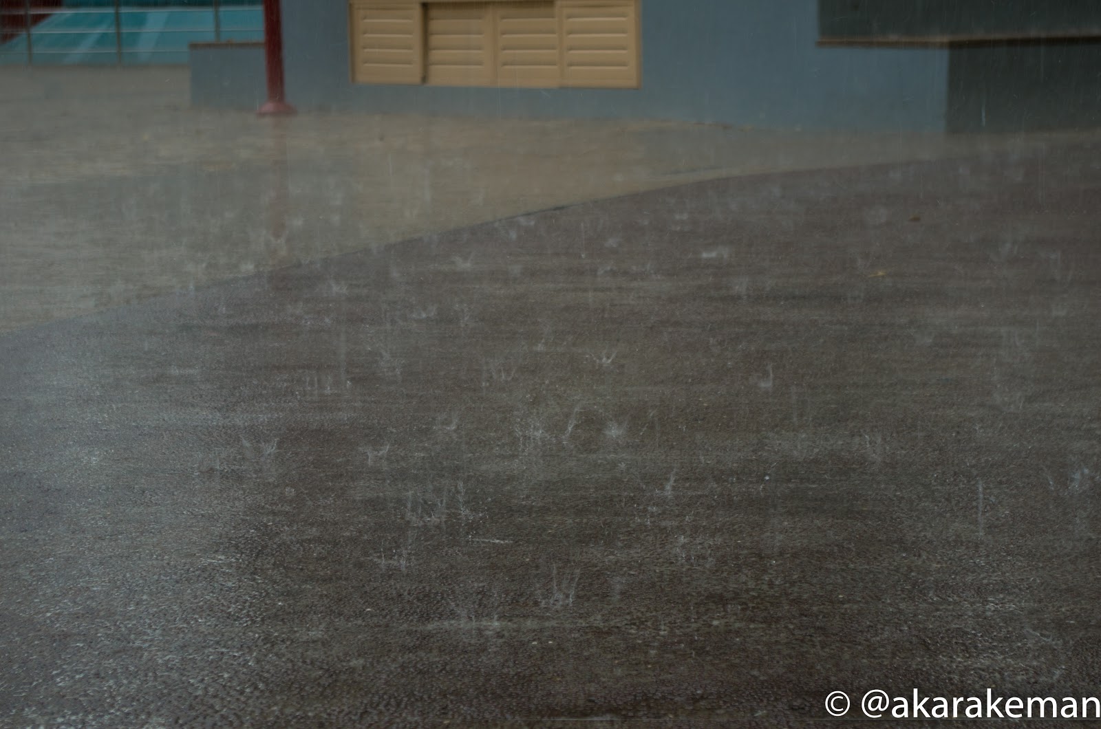 夕方、突然のスコール。大粒の雨がザーッと降ってきました。折りたたみ傘は無意味。